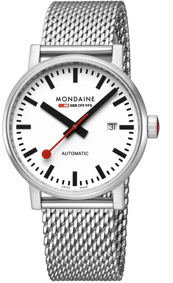 Mondaine Watch Evo2 40 Automatic Bracelet MSE.40610.SM. For more than 100 years the Swiss Federal Railways have been famous for punctuality and precision. Historically the train station manager used a special red Paddle to announce to passengers and train conductors that the train is about to depart. This red Paddle with its special shape is also the second hand of the Official Swiss Railways Clock. Mondaines original and authentic watch and clock collection captures this pristine and punctual look.