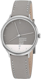 Mondaine Watch Helvetica No1 Light 38 MH1.L2280.LH. The first extension to the Mondaine Helvetica No1 Light collection uses subtle shades of grey to define its new Graphic Edition. Its future perfect design with brushed stainless steel case features a grey real leather strap, which beautifully highlights the subtle lugs, which are unique to this watch family. With all the design staples of its launch edition, this Graphic Edition is presented in an exclusive wrapped folder styled gift box which hosts a range of handpicked bespoke postcards featuring a variety of famous billboards celebrating the use of its muse, Helvetica.