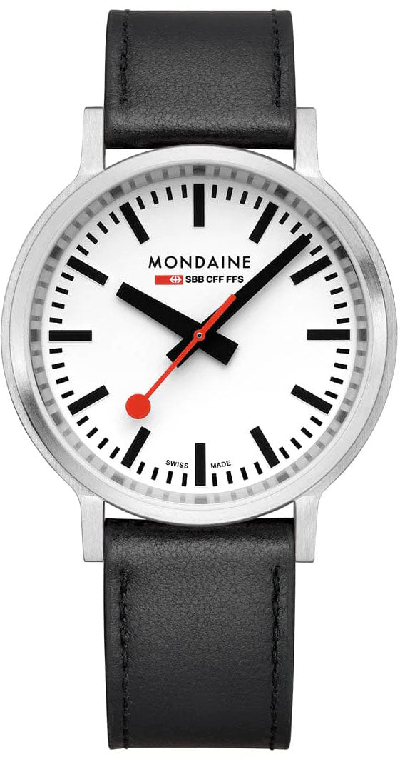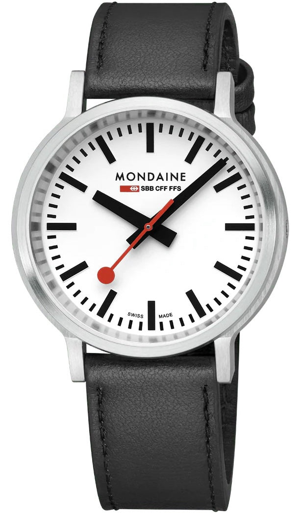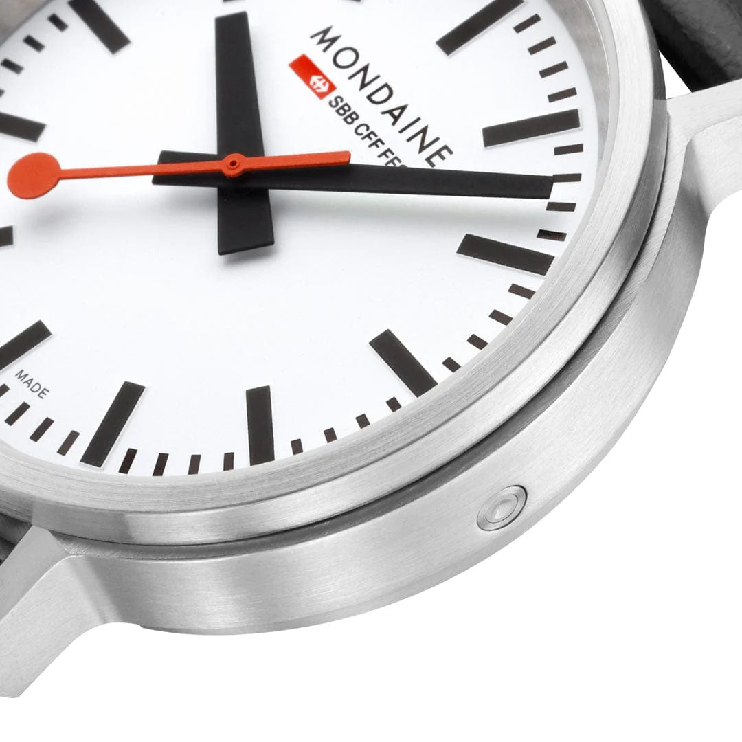Mondaine Watch SBB Stop2Go BackLight White Grape Leather MST.4101B.LBV.2SE. The stop2go collection not only inherits the minimalist and timeless design of the Swiss station clocks but also features a unique watch movement resembling that of this iconic clock. The distinctive red second hand of the wristwatch makes a full circle turn in 58 seconds and then waits for 2 seconds when it reaches the hour, allowing the minute hand to elegantly jump to the next minute. With its strong link to the history of the Swiss Railways clock, the stop2go is a true homage to MONDAINE's Swiss heritage and design. This extraordinary timepiece invites everyone to seize the opportunity and pause time, in a world that never seems to stop moving.