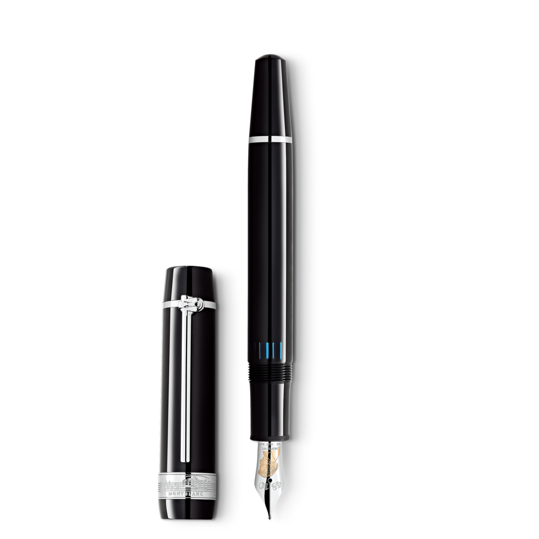 The Montblanc Donation Pen Collection is honouring world-famous classical musicians from past decades. The Donation Pen supports carefully selected cultural projects with a donation of 20 euros per fountain pen and 10 euros per ballpoint or rollerball. This year's edition pays tribute to Frédéric Chopin, a Polish composer and virtuoso pianist. As an homage to his admiration for the piano, the platinum-coated clip is shaped like a piano hammer. Known for his famous "La Note Bleue", the ink window of this Special Edition comes in a blue color. The cap ring features the musical notes of Chopin's first nocture, "Nocturne in B-flat minor, Op. 9, No.1", which was published in 1832. The cap and barrel are made out of black precious resin combined with platinum-coated fittings. The special gift box also contains a little note pad decorated with musical notes from his famous nocturne. The handcrafted Au 585 solid bicolor gold nib features a portrait of Frédéric Chopin.
