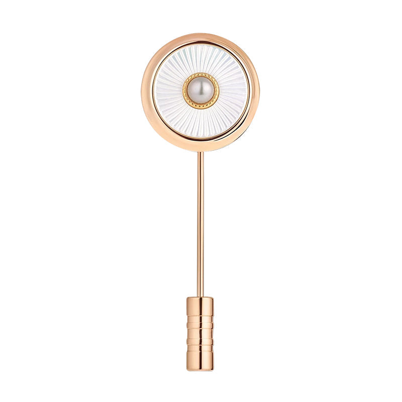 Lapel pin is made in stainless steel with gold colour PVD coating. Inlays are made in mother of pearl with guilloche pattern.