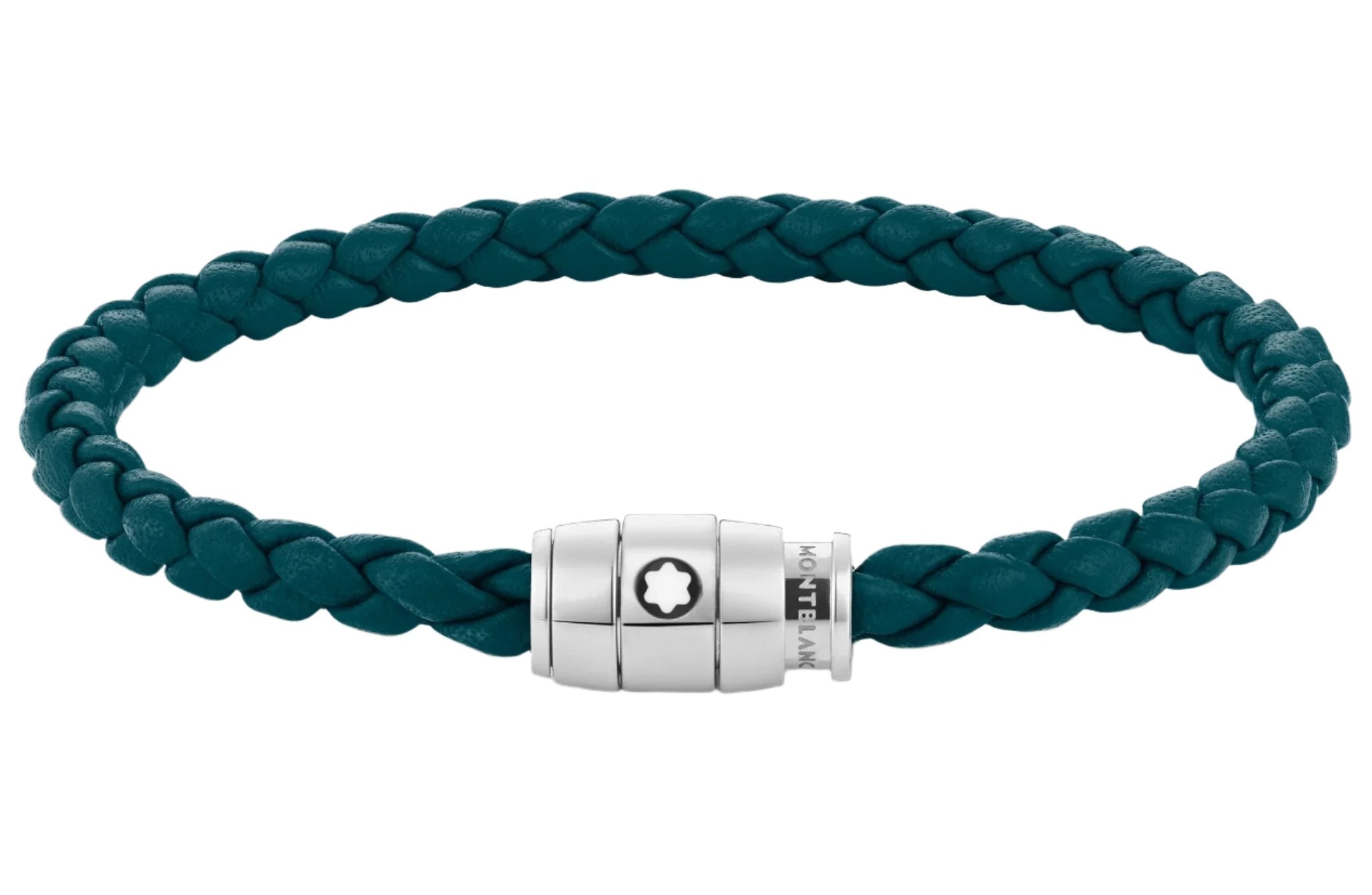 Montblanc Meisterstuck Steel 3 Rings Bracelet Size 68 134069. This piece of jewellery, woven from Cyprus blue leather, has a clasp made of polished stainless steel with Montblanc emblem (size 68)