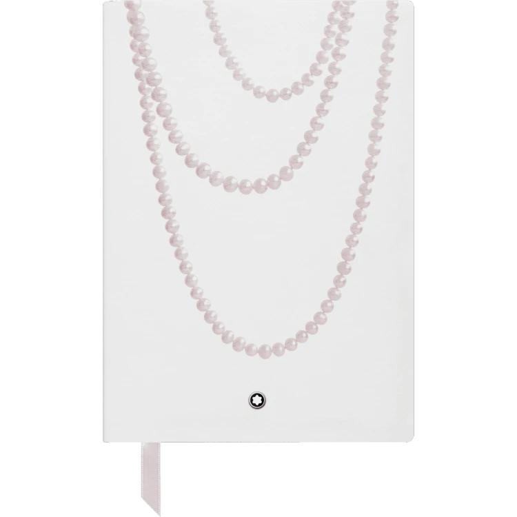 Montblanc Notebook 146 Ladies Edition Pearl White 118641. By introducing the new Fine Stationery line, Montblanc strives to fulfil its dedication to writing culture and the pleasure of writing. The Pearl Edition is one of two Ladies Editions with three pearl necklaces, a white inside cover and an elegant silver coloured bookmark. All Fine Stationery products are manufactured in Italy, crafted with Saffiano leather and high quality 85 g/m paper with 96 sheets/192 pages watermarked with the Montblanc emblem. Dimensions 150 x 210 mm.