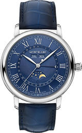 Montblanc Watch Star Legacy Full Calendar 42mm 130967. The Montblanc Star Legacy Full Calendar is one of the Maison’s bestselling collections, reflecting a need to track the time, days, and months that dates back to the earliest civilisations. This new 42mm model features a new midnight blue dial and the addition of the Maison’s interchangeable strap system. The timepiece comes with a blue sfumato alligator leather strap. It is powered by Montblanc’s newly revised Calibre MB 24.30 which includes a host of improvements in terms of performance, easy setting, and legibility.
