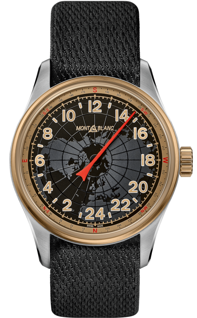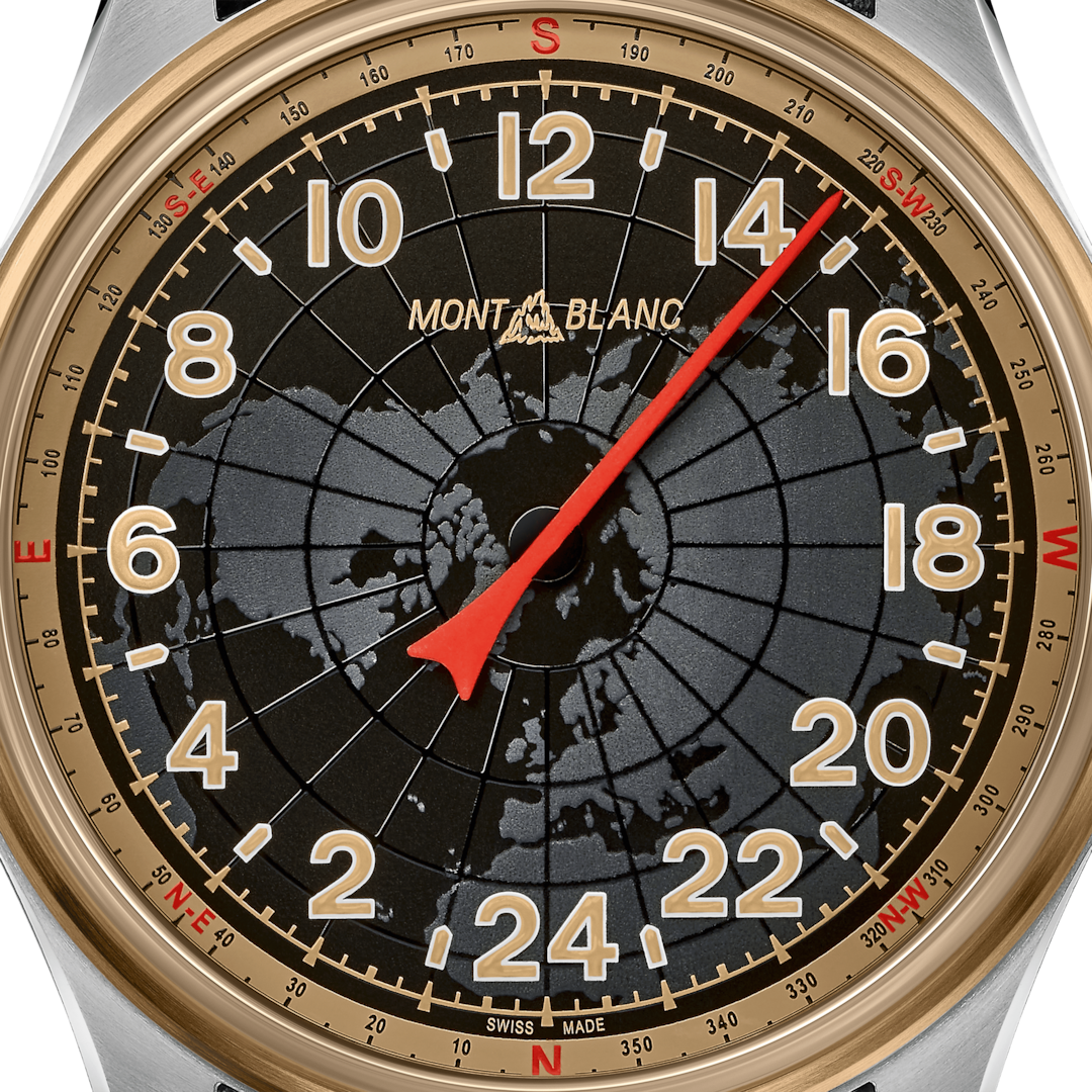 This Montblanc 1858 Automatic 24 Hour watch is not a timepiece you see every day. Its unique single-handed dial is dedicated to the modern-day explorer, indicating the time using a lone luminescent red-coloured hand. The hand points to the large Arabic numerals around the edge of the dial, counting the hours and the quarter hours through the printed indexes in between while the separation of the 12 hour marker at the top and 24 marker at the bottom gives you an arc of the day and night. Meanwhile, the bronze-coloured and red detailed compass scale at the circumference acts as a compass. To complete the dial of the Montblanc 1858 Automatic 24H watch, a black luminescent printed map of the northern hemisphere appears at night adorned with the 24 meridian lines.