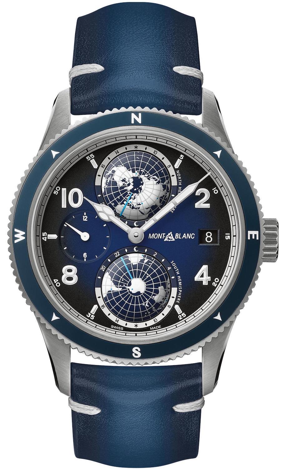In celebration of the 160th anniversary of Minerva, a foundation dedicated to classic fine watchmaking now owned by Montblanc, the Montblanc 1858 Geosphere watch collection delivers a series of professional-grade, innovative automatic winding watches with Swiss made movements. This breathtaking blue Montblanc 1858 Geosphere watch is also dedicated to the Seven Summits Challenge, the holy grail of climbers with an icy aesthetic inspired by glaciers, ice, and snowy mountain environments. The smoky blue dial is adorned with red dots on two turning globes to mark the world’s seven summits while the case back is engraved with the image of a compass, two crossed ice pickaxes and the emblematic Mont Blanc mountain.