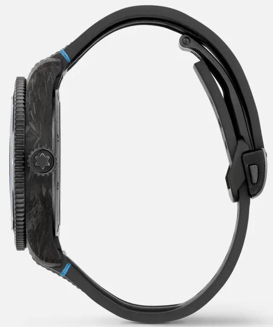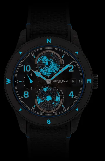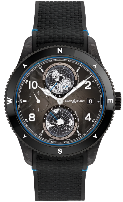 Montblanc Watch 1858 Geosphere CARBO2 0 Oxygen Limited Edition MB132300. With this limited edition timepiece showcasing a design as strong as the innovation within, Montblanc pushes the concept of oxygen – the central element in any intrepid ascent – even further than before. The watch case material, the CARBO₂, is created using a pioneering process development that captures CO₂ from biogas production and mineral wastes from recycling factories. Reinforcing the theme of adventure, the 43.5 mm case totally devoid of oxygen comes with an engraved luminous blue outline of the Mont Blanc Mountain on the side while a 3D colored laser engraving of the Mont Blanc mountain adorns the titanium case back. The timepiece is powered by the MB 29.25 automatic movement with Montblanc’s Manufacture worldtime complication, which includes rotating Northern and Southern Hemisphere globes, a 24-hour scale, Day & Night indications, dual time display, and a date. Completing the timepiece is a black interchangeable rubber strap featuring a taper and a fine adjustment system, with the pattern reminiscent of the textiles used by mountaineers.