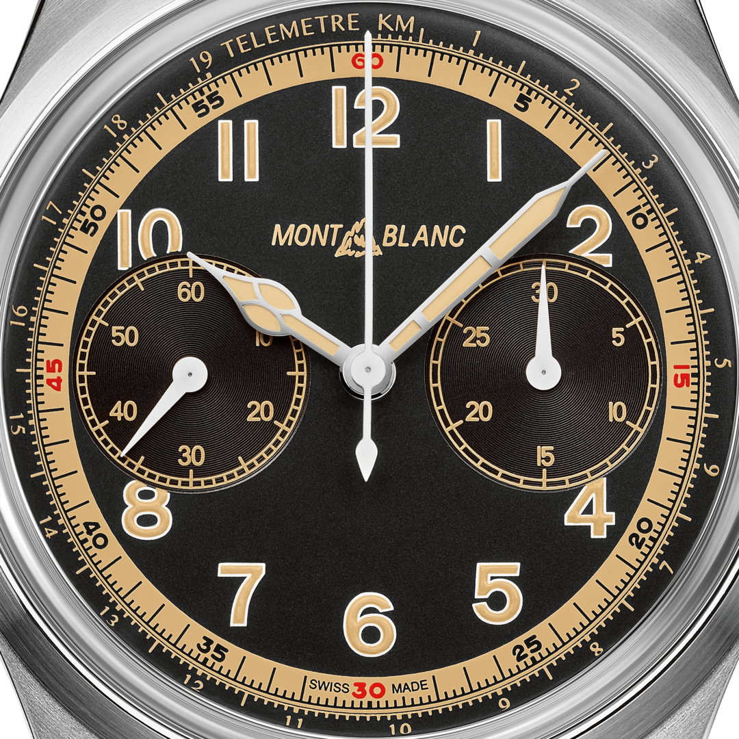 Inspired by the original Minerva watches from the 1920’s, this handsome Montblanc 1858 Monopusher Chronograph watch embodies the spirit of mountain exploration and the romantic notion of returning to nature. It’s combination of slim bevelled lugs, satin-finished detailing and smooth black dial makes it a perfect dress watch and yet its luminous cathedral hands, 100 metre water resistant rating and high-precision automatic winding movement makes it just as deserving of an outdoors instrument, perfectly commemorating its exploratory inspiration.