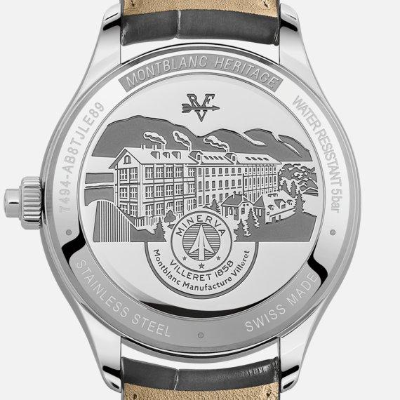 Alongside the impressive interior of the Montblanc Heritage Chronograph watch, the exterior delivers levels of sophistication known only to the luxury watch brand. It’s 41 millimetre casing is engineered from elegant polished stainless steel and includes a slim unadorned bezel, slender lugs, two piston styled chronograph pushers and a knurled crown. Sapphire crystal glass treated with anti-reflective treatment completes the front, protecting the two-toned white dial adorned with Superluminova rhodium-coated hour and minute hands and applique Arabic numerals while the back presents a stunning engraving of the Montblanc Minerva manufacture as it sits in Villeret, Switzerland. Completing the Montblanc Heritage Automatic Chronograph watch is a grey alligator leather strap crafted by the Montblanc Pelletteria in Florence, Italy.