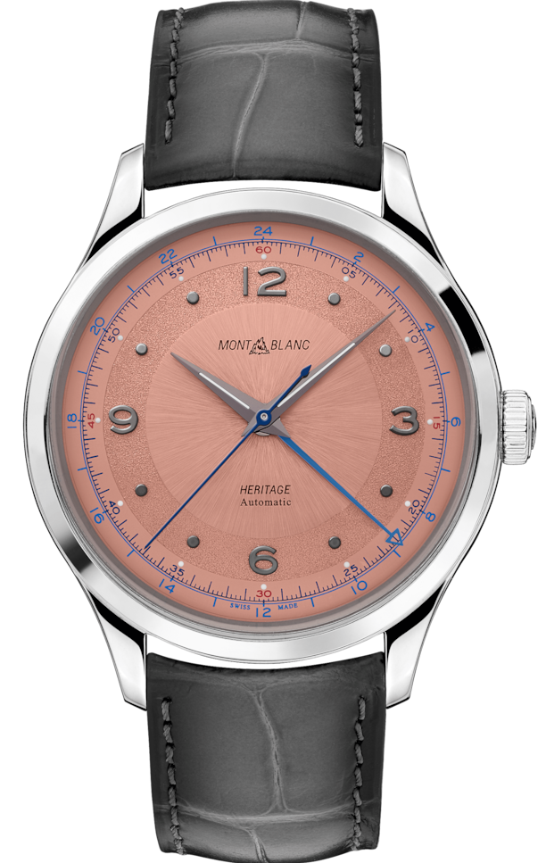 Drawing from the influence of the vintage Minerva watches from the 1940s and early ‘50s, the Montblanc Heritage watch collection was designed for those looking for a classic-looking timepiece with a serious vintage-inspired charm. The series is home to no shortage of complications including the classic chronograph, Monopusher chronograph, perpetual calendar, and now the coveted GMT complication. The Montblanc Heritage GMT is a must-have travel watch for the modern-day globe trotter featuring a statement blue coloured second time zone hand at the centre pointing to the matching blue 24 hour scale reaching the edge of the dial. To pair, a central seconds hand is also dressed in blue to contrast elegantly against the rare salmon pink dial.