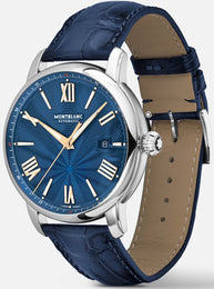 Montblanc Watch Star Legacy Automatic Date Limited Edition MB130956. The Montblanc Star Legacy Automatic Date Limited Edition of 800 pieces is adorned with a blue dial featuring Montblanc’s signature exploding star pattern, and rose gold-coated sword-shaped hands and numerals. It is powered by the MB 24.17 automatic movement that indicates the hours, minutes, seconds, and date. In terms of design, the timepiece has been inspired by Minerva pocket watches from the late 19th and early 20th century with their round, polished, pebble-shaped cases and onion-shaped crowns. This timepiece is also fitted with an interchangeable blue calf leather strap with alligator print and tone-on-tone stitching.