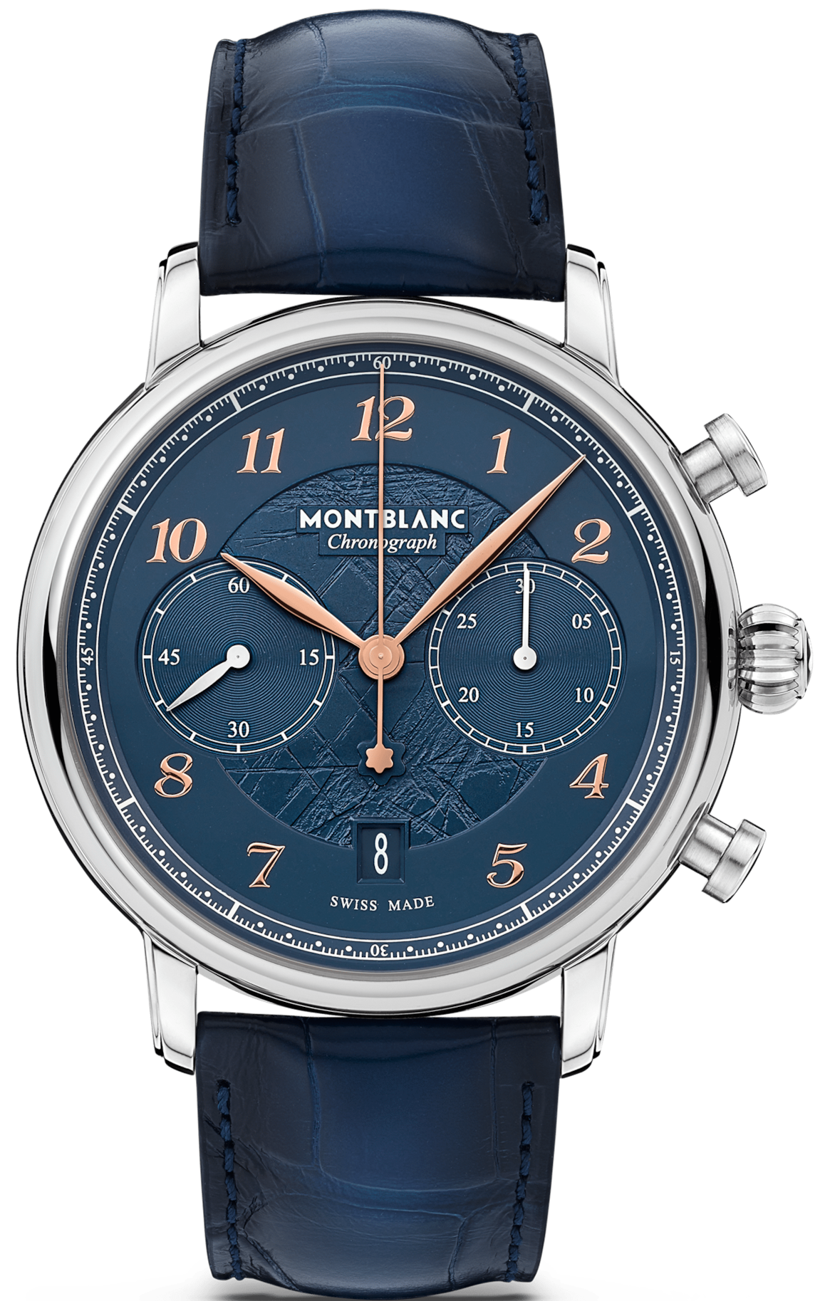 Montblanc Watch Star Legacy Chronograph Limited Edition 129626. The Montblanc Star Legacy Chronograph is limited to 1786 pieces and comes in a 42mm pebble-shaped stainless steel case with rose gold-coated Arabic numerals and an eye-catching blue glacier pattern dial. The dial is decorated with a layered ice design that was inspired by the Mer de Glace, the main glacier of the Mont-Blanc Mountain. The centre of the dial is created using a special stamp that reproduces this glacier texture and celebrates the "blue hour" - "l'heure bleue", during which a shade of intense blue falls upon the glacier at dusk when the moon rises and the stars begin to shine. It was at this time of day that Jacques Balmat became the first person to reach the summit of the Mont Blanc – at 18h23 on August 7th in, 1786. Functions include hours, minutes, central seconds with a Montblanc emblem on the counterweight, chronograph, and a date that are powered by the MB 25.13 automatic movement that can be admired through a sapphire crystal case back. The time functions are displayed with rose gold-coated leaf-shaped hands, while the chronograph indications use rhodium-coated “baton hands. The timepiece is paired with a blue Sfumato alligator strap.