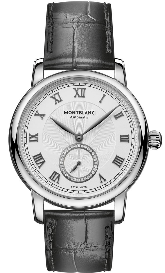 At its centre, the Montblanc Star Legacy Small Second watch houses the Calibre MB 24.16 automatic winding movement which alongside its innovative flat hairspring provides 27 jewels and a power reserve of 42 hours. The central hands for hours and minutes sit uniquely away from the small seconds dial at 6 o’clock which dazzles endlessly with its own guilloche Montblanc star-burst centre and border of 28 diamonds. The rest of the dial is also detailed with exploding silver guilloche, a black railway minutes track, Roman numerals and slim leaf-shaped hands. To protect the movement and provide a water resistant rating of 30 metres, the 36mm stainless steel case is equipped with a non-screw crown decorated with the famous Montblanc star emblem, a polished bezel and domed sapphire crystal glass, a material famed for its scratch resistance and anti-reflective coating. To complete the Montblanc Star Legacy watch, a grey alligator leather strap is added handcrafted in the Montblanc Pelletteria in Florence.