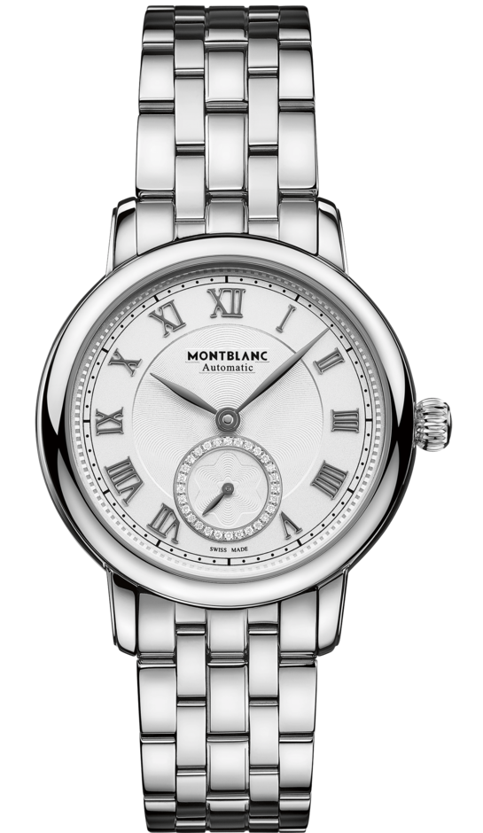 At its centre, the Montblanc Star Legacy Small Second watch houses the Calibre MB 24.22 automatic winding movement which alongside its innovative flat hairspring provides 27 jewels and a power reserve of 42 hours. The central hands for hours and minutes sit uniquely away from the small seconds dial at 6 o’clock which dazzles endlessly with its own guilloche Montblanc star-burst centre and border of 28 diamonds. The rest of the dial is also detailed with exploding silver guilloche, a black railway minutes track, Roman numerals and slim leaf-shaped hands. To protect the movement and provide a water resistant rating of 30 metres, the 32mm stainless steel case is equipped with a non-screw crown decorated with the famous Montblanc star emblem, a polished bezel and domed sapphire crystal glass, a material famed for its scratch resistance and anti-reflective coating. To complete the Montblanc Star Legacy watch, a five row bracelet is added fastened by a classic deployment buckle.