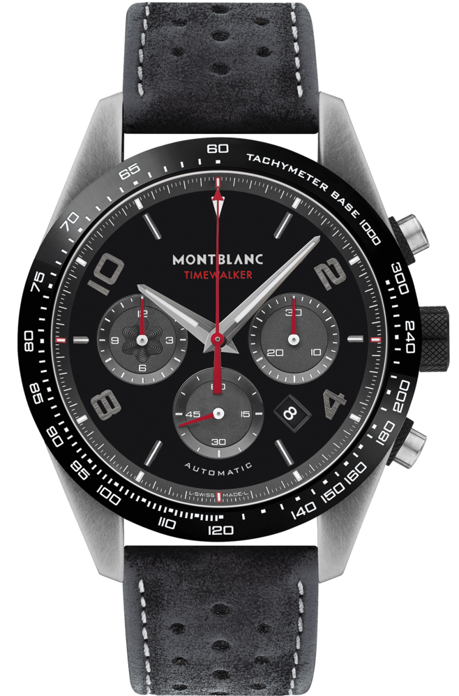 Enthusiasts of motorsport and fine luxury watch manufacture need look no further than the Montblanc TimeWalker Chronograph collection. Inspired by Minerva’s outstanding history, Montblanc’s innovative technology and the golden age of motor racing, the series brings to life a wonderfully retro aesthetic awakened by some of the best Swiss made technology. Instantly, the smooth black dial at the centre evokes the speedometers of classic race cars with contrasting anthracite grey chronograph counters, rhodium Superluminova coated Arabic numerals and vivid red colouring found predominantly on the large chronograph seconds hand.