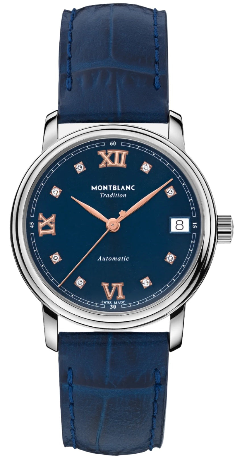 Montblanc Watch Tradition Automatic Date Ladies MB129642. The Montblanc Tradition Collection boasts both a characteristic Montblanc design expression as well as classic watchmaking codes. The Montblanc Tradition Automatic Date comes in a 32 mm stainless steel case with straight horns and a double-shaped bezel. The timepiece features a blue sunray dial with rose gold-coated Roman numerals in relief and diamonds indexes. The traditional railway minuterie, the classic leaf-shaped hour and minute hands, the seconds hand and crown with Montblanc emblem and blue calf strap with alligator print complete this contemporary elegant appearance. The date is displayed at 3 for very practical day-to-day use. Finally, the sapphire crystal on the case back opens on the automatic movement.