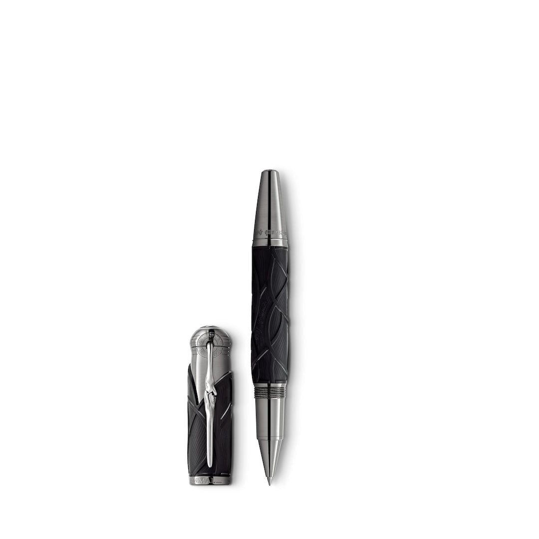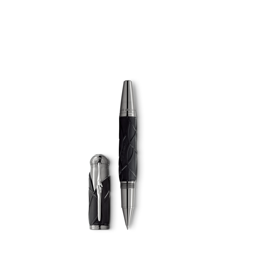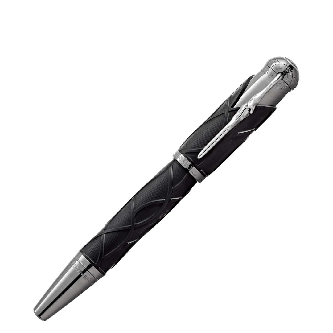 "Once upon a time..." The Montblanc Writers Edition Homage to Brothers Grimm is dedicated to Jacob and Wilhelm Grimm and celebrates their work on German and European folk tales among which are some of the most famous fairy tales such as "Snow White", "Cinderella" and "Sleeping Beauty". The overall silhouette of the writing instrument is shaped like an old hiking stick and the Black colour resembles the darkness of the woods which usually serve as the main stage for the Brothers Grimm´s folklore. In addition, the wave-like pattern on the cap and barrel is inspired by Rapunzel´s hair while also resembling roots as the Brothers Grimm viewed their linguistic work as "research into roots". The cap is crowned by the Montblanc Emblem in precious resin. The platinum-coated clip, reminiscent of a knobby piece of wood, surprisingly reveals the silhouette of the profile of the Brothers Grimm when turned.