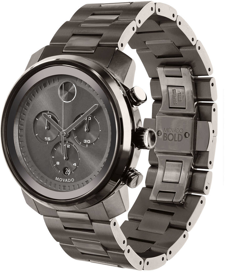 Movado Bold Watch 3600277. Large Movado BOLD chronograph, 44 mm gunmetal gray ion plated stainless steel case, K1 crystal with a ring of highly reflective gunmetal gray metallization, gunmetal gray dial with matching subdials, sunray dot, hands and stamped hour/minute index, and date display, gunmetal gray ion plated stainless steel link bracelet with push button deployment clasp.