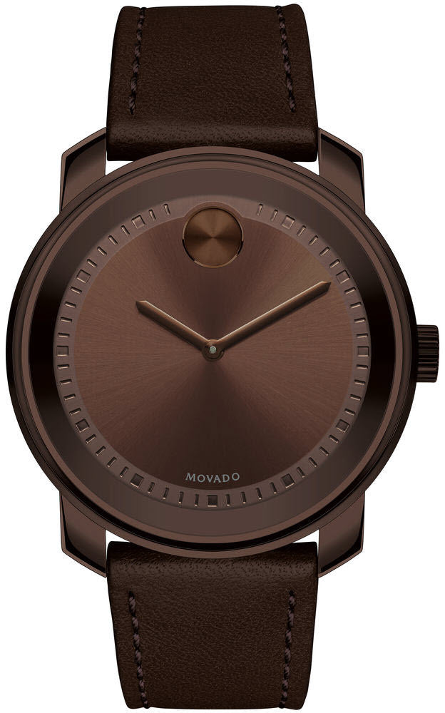 Movado Bold Watch 3600377. Large Movado BOLD watch, 42.5 mm brown ion plated stainless steel case, K1 crystal with a ring of highly reflective brown metallization, brown dial with matching sunray dot, hands and stamped hour/minute index, brown Colorado bull hide leather strap with matching top stitching, brown ion plated stainless steel buckle.