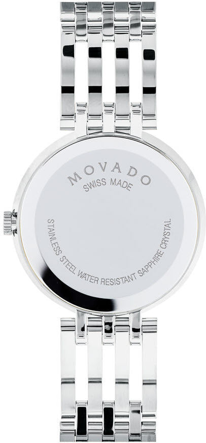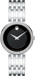 Movado Watch Esperanza 607052. Womens Esperanza watch, 28 mm stainless steel case with 63 diamond bezel (0.245 t.c.w.), matte black Museum dial with raised lacquer finish outer ring, and silver toned dot and hands, stainless steel free falling bracelet design with signature open vertical links and push button deployment clasp.