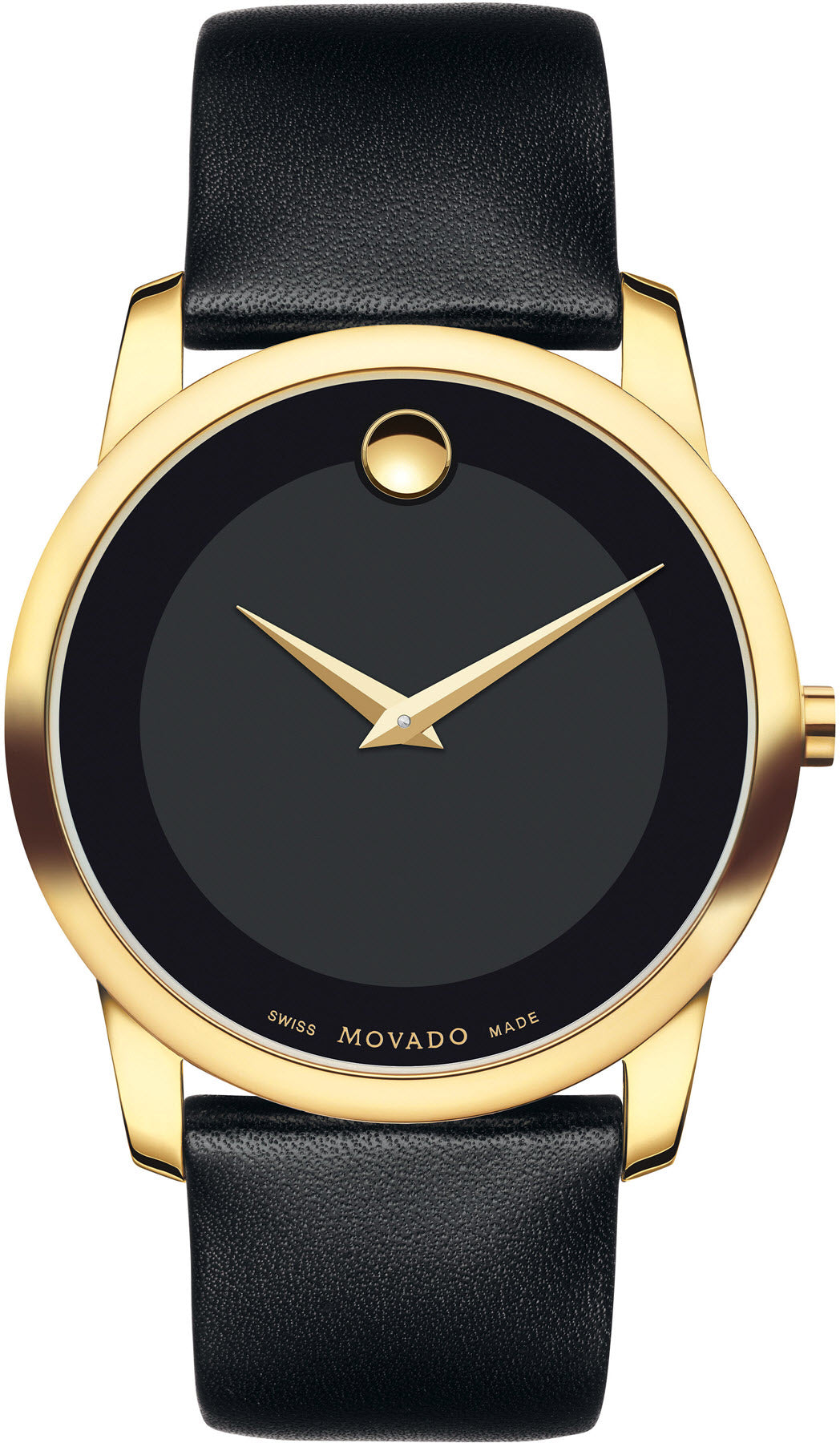Movado Watch Museum Mens 0606876. Mens Museum Classic watch, 40 mm yellow gold PVD finished stainless steel case, black Museum dial with tone on tone outer ring and gold toned dot and hands, black calfskin strap with yellow gold PVD finished stainless steel buckle.