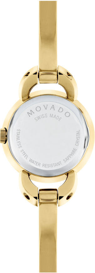 Movado Watch Rondiro 606888. Womens Rondiro watch, 22 mm yellow gold PVD finished stainless steel case with open semicircular lugs, black Museum dial with yellow gold toned dot and hands, slender yellow gold PVD finished stainless steel bangle style bracelet with back sizing links and jewelry clasp.