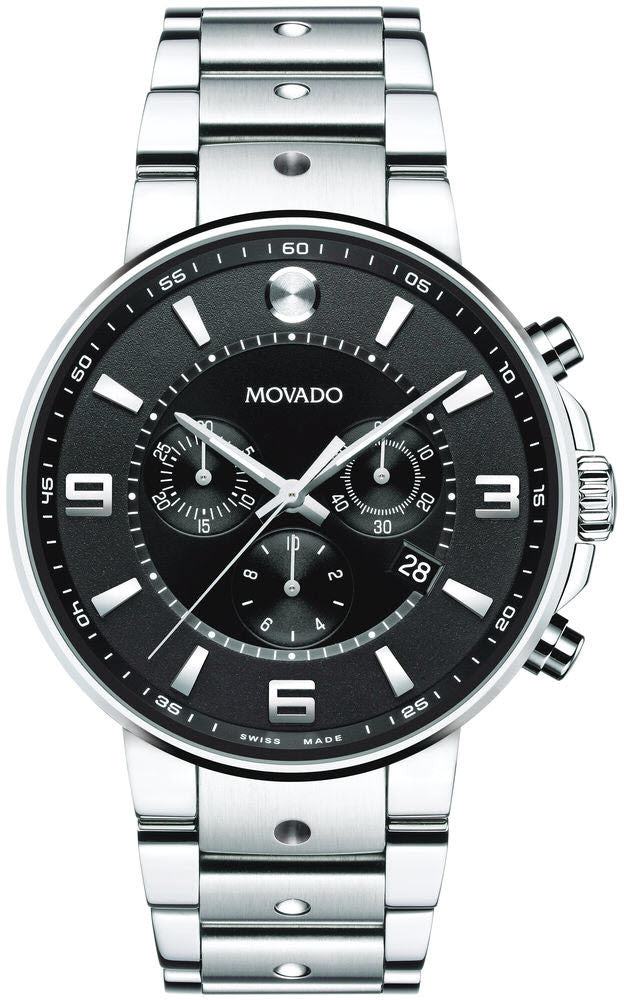 Movado Watch SE Pilot 606759. Mens SE Pilot chronograph, 42 mm stainless steel case, round bi level black soleil dial with minute reflector, 3 black timing subdials, silver toned dot, applied Arabic numerals and markers, luminescent hands, and date display, stainless steel signature dot motif link bracelet with push button deployment clasp.
