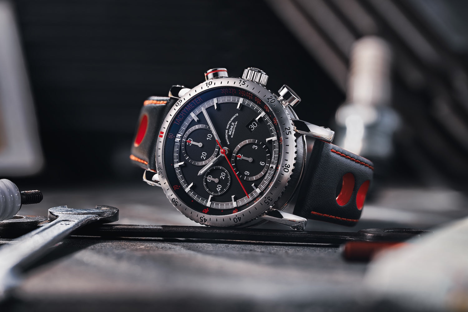 Muhle Glashutte Teutonia Sport I Watch M1-29-63-LB-II. Whether it's the Nürburgring or the Sachsenring: the Teutonia Sport I is not only keen to measure the time required for a particular route, it would also like to translate this into speed. This is made possible by the tachymeter function of our sports chronograph. In relation to a distance of 1000 meters, you can read the speed at a glance on the tachymeter scale of the rehaut.