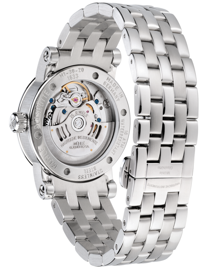 Muhle Glashutte Watch Teutonia II Medium. The clear dial design emerges particularly clearly with the Teutonia II Medium. With an adapted design, despite its 34 mm diameter, time is optimally readable here, too. The smallest model of the Teutonia family is in no way inferior to its brothers. The efficient Muhle rotor as well as the shockproof woodpecker neck regulation are to be found here, too. Characteristics that make the timepieces by Muhle reliable and highly precise. However, besides these features, optimal appearance also always plays an important role in daily business life. And so the solarization of the Teutonia II Medium makes it shine subtly on every wrist. Supplier Model Number M1-30-22-MB