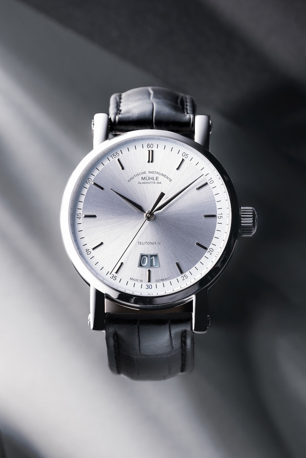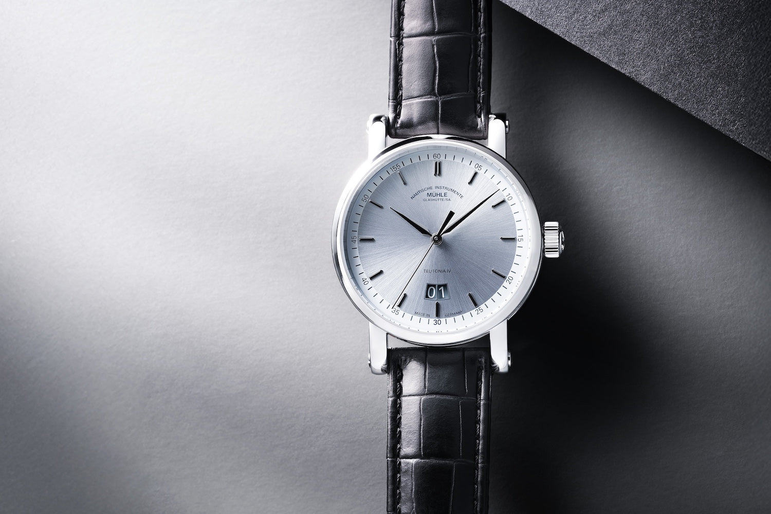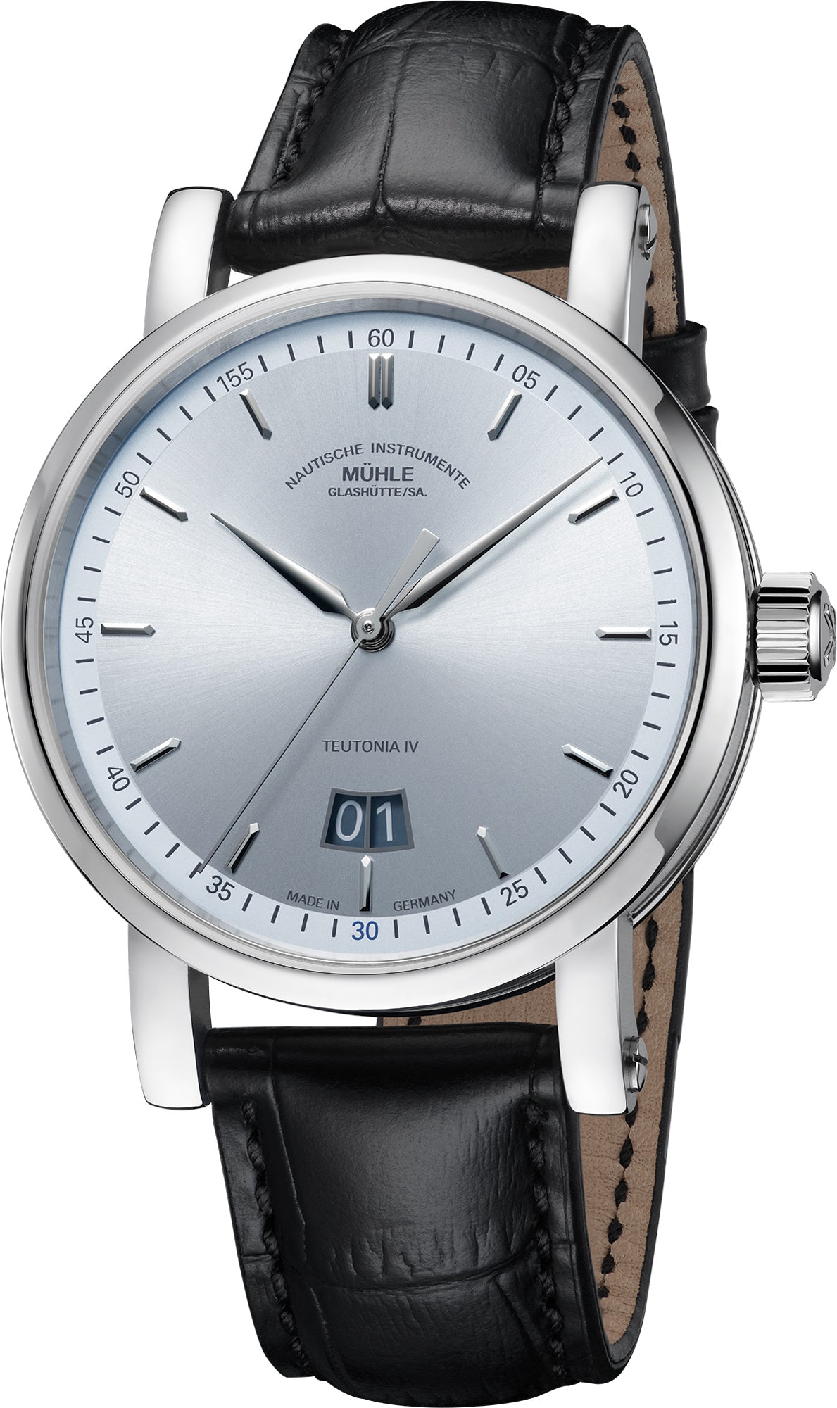 Muhle Glashutte Watch Teutonia IV Big Date Limited Edition M1-44-72-1994-LB. The Teutonia is more than just an elegant business watch, it is also the timeless classic at the heart of the Muuhle collection. It therefore comes as no surprise that it plays a role in Mühles anniversary year 2024, fitted with the complication that marked the birth of the successful watch family, the big date display. The Edition model also features a Muhle module which was designed in house and celebrates its premiere in the MU9424-GD movement.