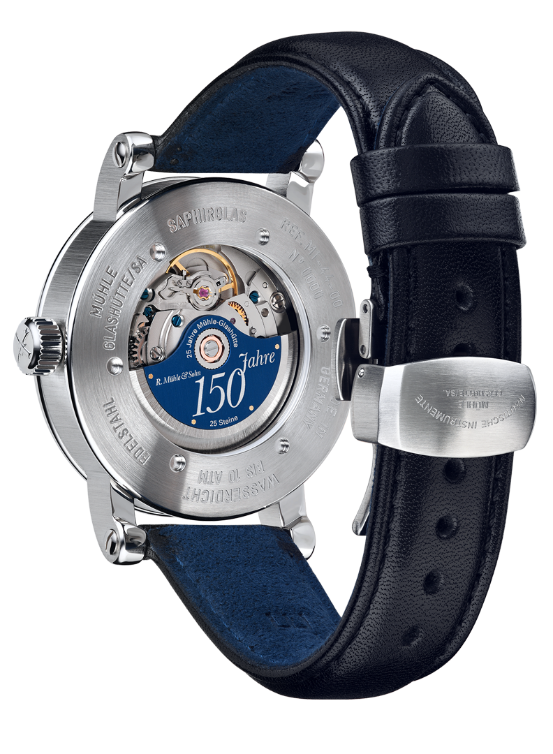 Muhle Glashutte Watch Teutonia IV Moonphase M1-44-05-LB. The case of the watch is another a prime example of top Muhle Glashutte quality. As is typical of the Muhle Glashutte watches Teutonia family, the middle of the case features the companys characteristic vertical finish, as always carefully applied by hand. The top surfaces of the volute shaped lugs are polished and perfectly harmonise with the extremely straightforward new design of the bezel, which in turn stunningly complements the clean cut appearance of the Teutonia IV Mondphase.