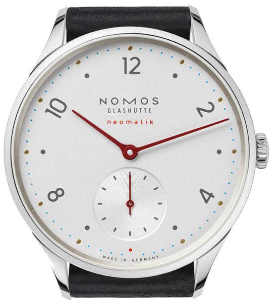 Nomos Glashutte Watch Minimatik Neomatik 1201. Winner of the renowned iF Gold Award, known as the Oscar of the worldwide design industry, this Nomos Glashutte Minimatik Neomatik watch has taken over the watch industry with its minimalistic and classic design. Glistening through the scratch resistant sapphire crystal glass is a crisp silver white dial with subtle touches of venetian red, cyan blue and soft gold tones that grace the pearled indexes, hands and markers.