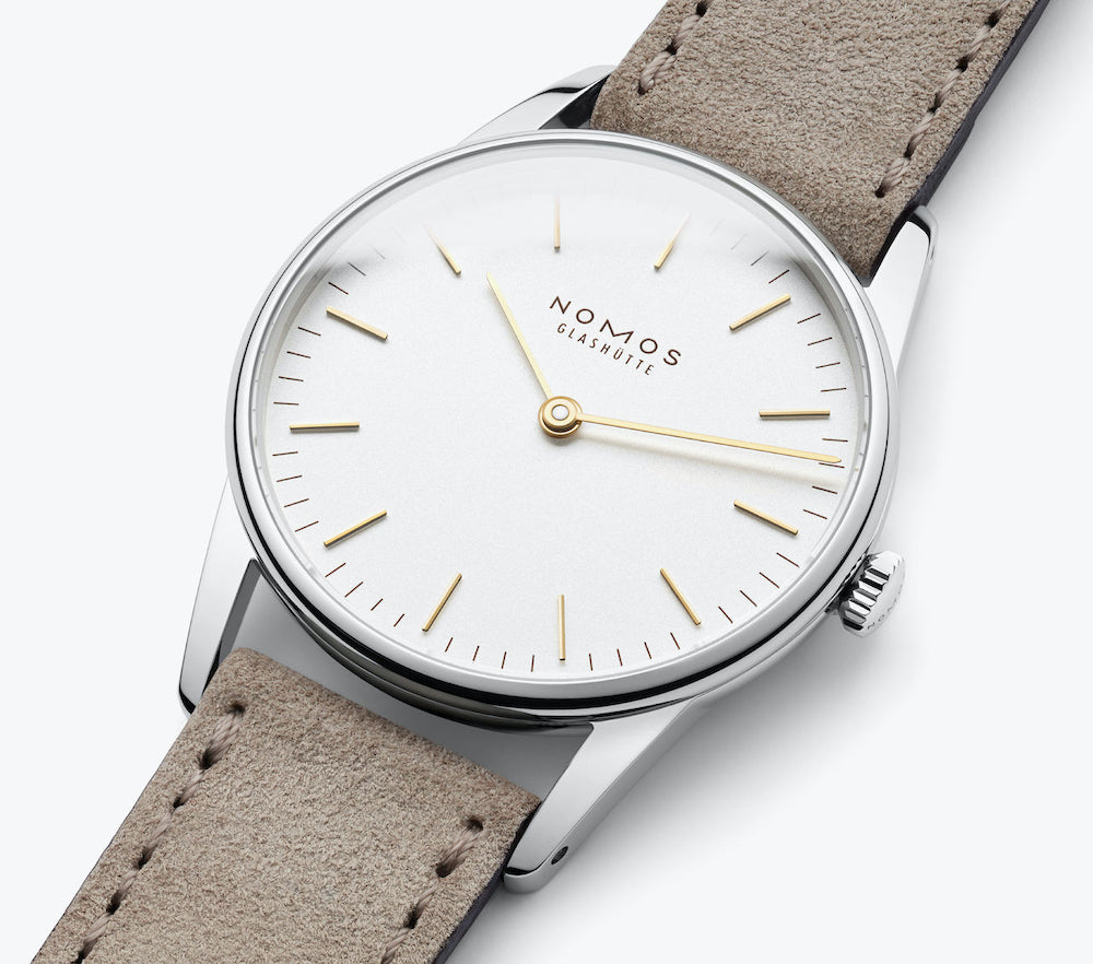 Nomos Glashutte Watch Orion 33 Duo Sapphire Crystal Glass Back 320. Golden hands, a stainless steel case, white silver plating, Orion 33 duo compliments any jewelry, and its 33 millimeter diameter suits more slender wrists particularly well. With only two golden hands, the design is even more refined and elegant than the standard version of Orion.