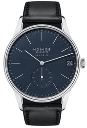 Nomos Glashutte Watch Orion Neomatik 41 Date Midnight Blue Sapphire Crystal 363. For a long time, Orion was only available with manual winding, since only a very thin movement would fit into its elegantly domed stainless steel case. Our neomatik calibers upgraded the watch to an automatic timepiece and a date function has made the still super slender Orion grow to a diameter of 41 millimeters. And now it is also available in an elegant midnight blue.