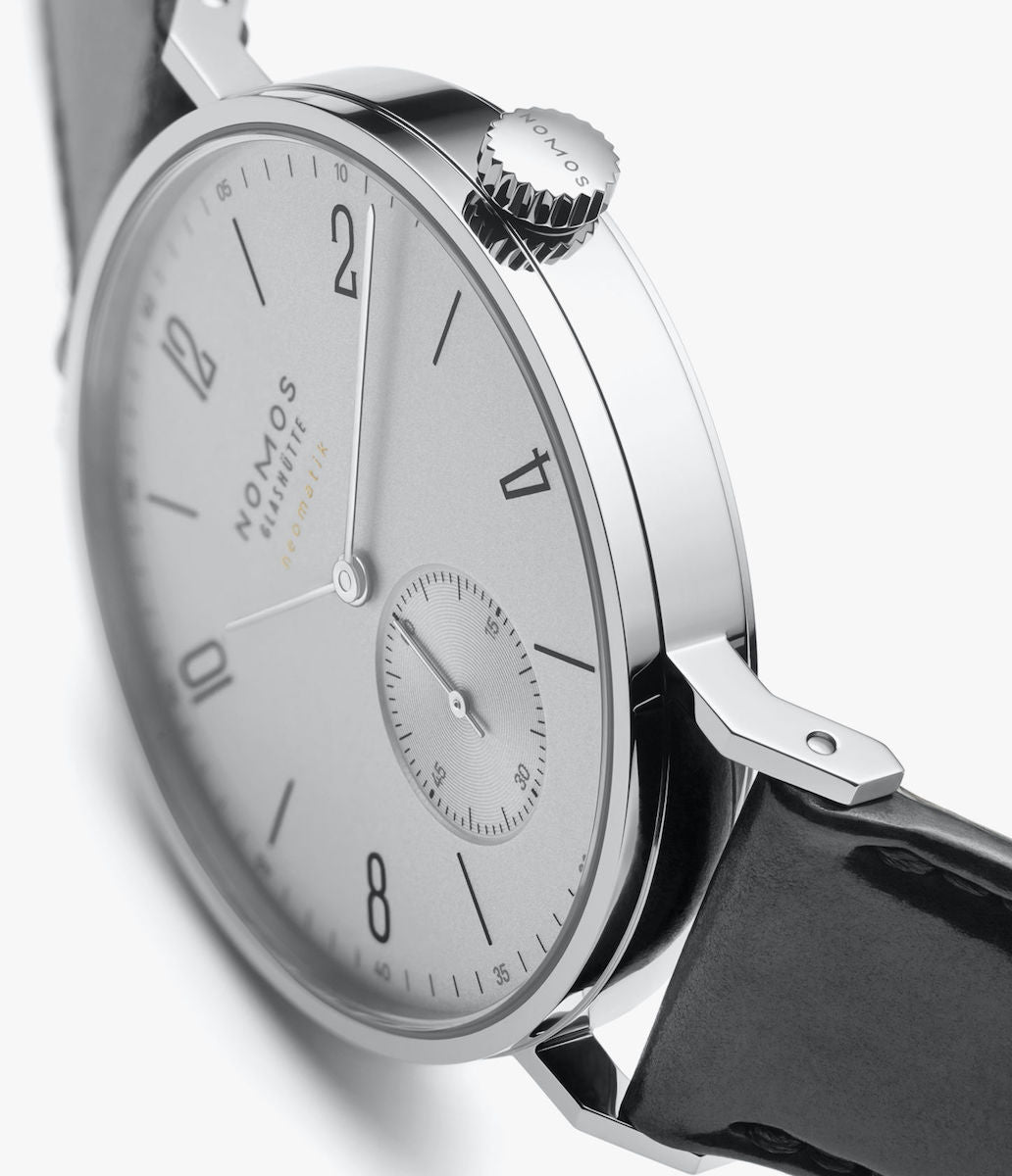 Nomos Glashutte Watch Tangente Neomatik 39 Platinum Grey 143. With Tangente neomatik 39 platinum gray, NOMOS Glashutte has created an elegant automatic watch, full of technical ingenuity of the highest quality. With a movement height of just 3.2mm, its neomatik caliber DUW 3001 sits perfectly into the slender steel case. The bidirectional winding rotor captures kinetic energy and stops when fully wound, protecting the mainspring of this enduring timepiece. The NOMOS swing system ensures the highest level of accuracy. The refined surfaces of the movement are lavishly decorated. The platinum gray on the dial underscores the value of this watch.