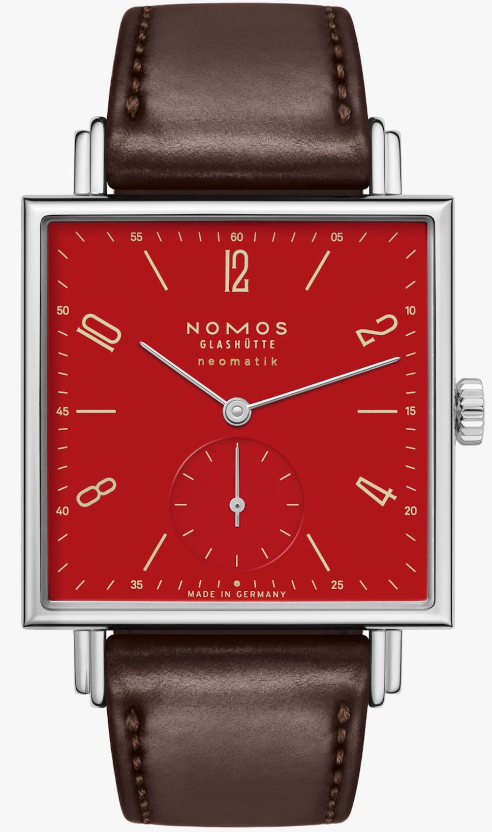 Nomos Glashutte Watch Tetra Neomatik Red Limited Edition 421.S2. Not to be overlooked: Tetra neomatik red. The opaque surface of the glossy enamel-like dial reflects the light, increasing the color intensity of this extravagant automatic watch. Precisely timed rhodium plated hands sweep across the rectangular dial. As the lettering under the signature indicates, a top class automatic movement is at work in the watches of this limited edition. The neomatik DUW 3001 caliber is equipped with the NOMOS swing system, the famous proprietary escapement that achieves the very best accuracy in chronometer tests.