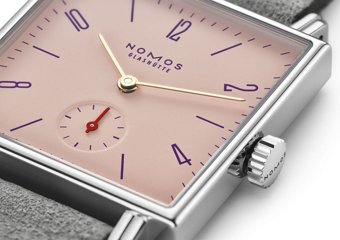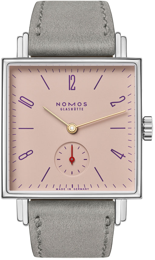 Nomos Glashutte Watch Tetra Pearl Sapphire Crystal 493. Watch hands move in a circle, and yet this watch is square. This shape simply looks better on some wrists. Tetra is a fine Glashutte timepiece, straightforward, clear, perhaps rather independent minded.
