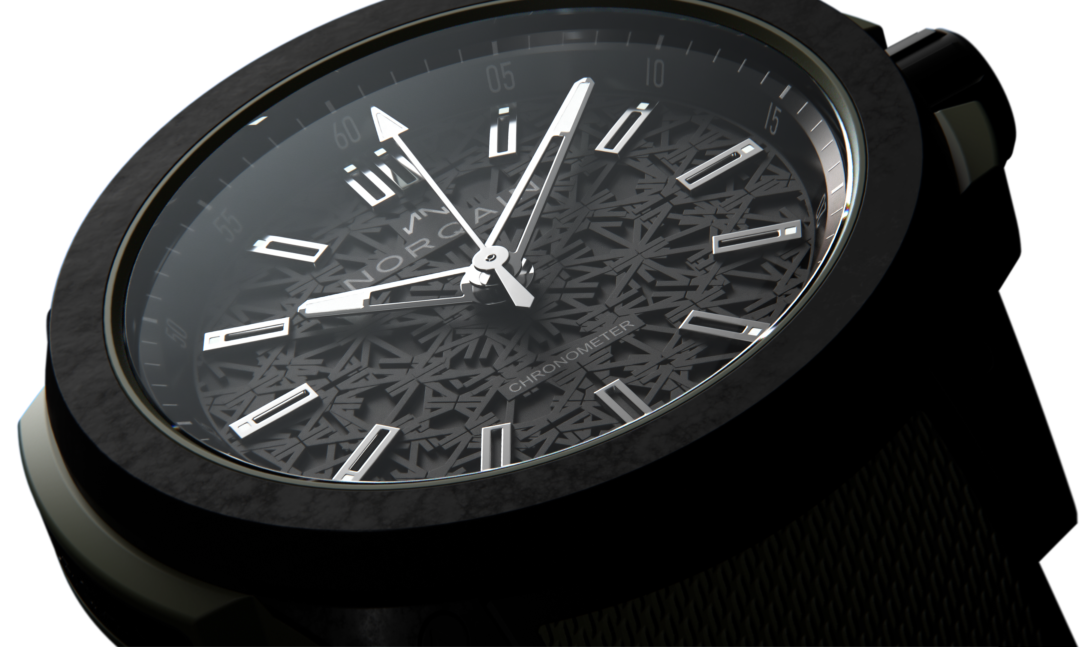 Norqain Watch Wild One & Norteq Black Black Mesh NNQ3000QBK1A/B002/3W1BR.20BQ. NORQAIN launches the ultimate sports watch with its own ground breaking material: NORTEQ. Independence Wild ONE: NORQAIN develops innovative sports watch concept and high-performance material with industry legend Jean-Claude Biver and leading swiss suppliers. The Wild ONE collection: 100% Swiss-made, super light and a revolutionary construction. The case has separate top and bottom NORTEQ parts which serve as a protective cage and are connected and secured with custom-made screws. Between these parts is a rubber shock absorber that surrounds a titanium container in which ticks the NN20/1 Manufacture Calibre. The rubber bumper reliably absorbs shocks during even the most extreme activities.