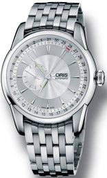 Oris Artelier Small Second Pointer Date is an exceptionally elegant dress watch for gentlemen. It is equipped with Oris 644 automatic calibre, a modification of ETA 2836-2 automatic calibre. The movement performs 28 800 vibrations per hour and has 27 bearing jewels. A 38-hour power reserve is available for the convenience of the wearer. Hands and indices are luminous for improved night time visibility. Subsidiary seconds are available at the 9 o'clock mark. A separate hand and a scale around the outer rim of the dial provide information about the date. Additional useful features include silver and grey guilloche dial, stainless steel crown, see-through case back and scratch-resistant sapphire crystal glass with anti-reflective coating.
