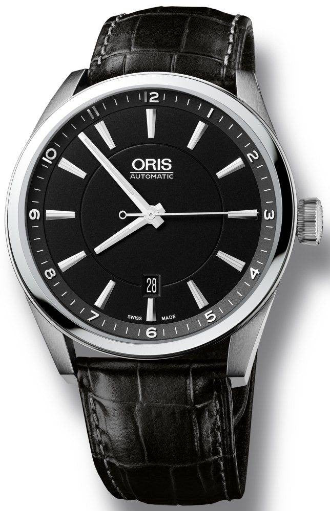 Oris Watch Artix. Oris Artix Date is a very stylish watch for gentlemen that brags original and enticing 3D design. It is equipped with Swiss made Oris 733 automatic calibre that performs 28 800 vibrations per hour and has 26 bearing jewels. A 38 hour power reserve is available for the convenience of the wearer. Hands and indices are luminous for improved night time visibility. A date display is positioned at the 6 o clock mark. Additional useful features include see through case back, stainless steel crown and scratch resistant sapphire crystal glass with anti reflective coating.