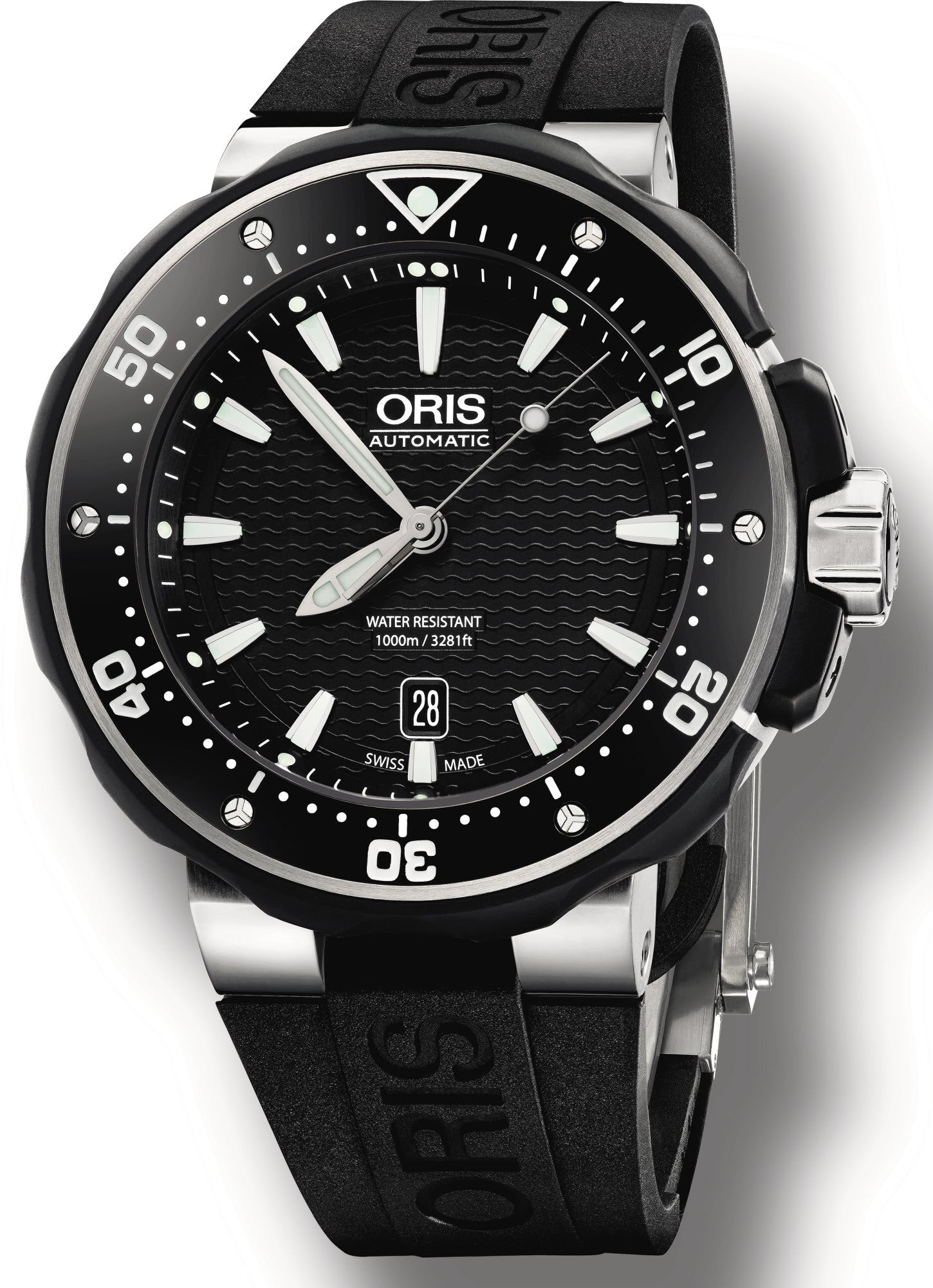 Oris Watch Prodive Date. No holds barred Based on its bigger brother, the Oris ProDiver Chronograph, this watch is safe, sturdy and solid. The titanium case, ceramic top ring, crown protection, innovative Oris Rotation Safety System (RSS), and automatic helium valve are standard ProDiver features. At 49mm in diameter, it may be smaller than the chronograph, but it's just as impressive. No restrictions, no rules, just pure Oris.