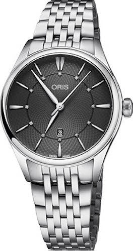 The automatic movement within this Oris Artelier Date watch continues to impress by equipping the dial with sleek hour, minute and seconds function, an elegant date window at 6 o clock and an impressive power reserve of 38 hours. Each of these functions are displayed beautifully on the dark grey guilloche dial decorated with diamond dot indices which are kept housed beneath highly scratch resistant sapphire crystal glass treated with an anti-reflective coating. As well as boasting Superluminova coated hands and a 50 metre water resistance, this Oris Atelier watch for women is completed by a sophisticated stainless steel bracelet and folding style clasp.