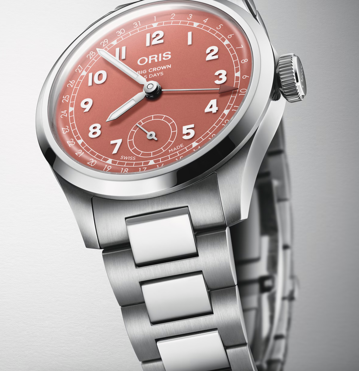 Oris Watch Big Crown Pointer Date Calibre 403 Terracotta 01 403 7799 4068-07 8 20 06. How do you improve a classic? With this Big Crown Pointer Date, our signature design, you get a 40.00 mm stainless steel case, a terracotta dial and an H-link bracelet with an Oris developed clasp that wraps seamlessly around your wrist. A multi-activity watch for today’s world citizen.