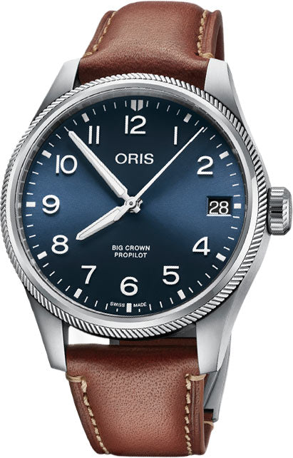 At the heart of this Oris Big Crown ProPilot Big Date watch is the powerful Oris 751 automatic winding movement which equips the timepiece with classic hour, minute and seconds function, an enlarged date window at 3 o clock and a power reserve of 38 hours. The striking blue dial is housed beneath scratch resistant sapphire crystal glass treated with an anti-reflective coating and decorated with Arabic numerals and large propeller style hands layered with glow in the dark Superluminova. For the finishing touch, this Oris Big Crown ProPilot is fitted with a sophisticated brown calfskin leather strap and a stainless steel folding buckle.