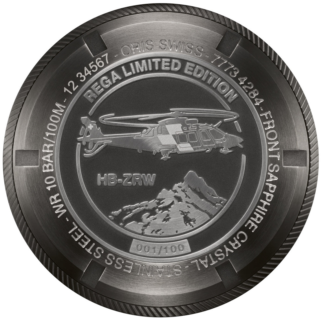 Oris Watch Big Crown ProPilot Rega Fleet AgustaWestland Da Vinci HB-ZRW Limited Edition 01 798 7773 4284 HB-ZRW-Set. Rega’s fleet of 21 aircraft used for lifesaving air rescue missions across the Swiss Alps is celebrated in this collaborative model in a limited edition series of 100 pieces. An image of the AgustaWestland Da Vinci HB ZRW aircraft is engraved into the surface of the watch’s stainless steel caseback, along with a serial number relating to the watch and the aircraft’s unique tail number. This 100 meter water resistant steel pilot’s watch for men is finished with a striking gunmetal PVD coating and features a double domed sapphire crystal glass front that protects a matte black dial. The display is home to a black coated second hand, a red arrow tipped GMT hand pointing to a 24 hour scale, a date window at 3 o’clock, luminous hour and minute hands and white Arabic numeral hour markers. A [pulsometer scale is engraved into a bidirectional rotating bezel and the watch is powered by the self winding Oris 798 movement, complete with an autonomy of 42 hours.