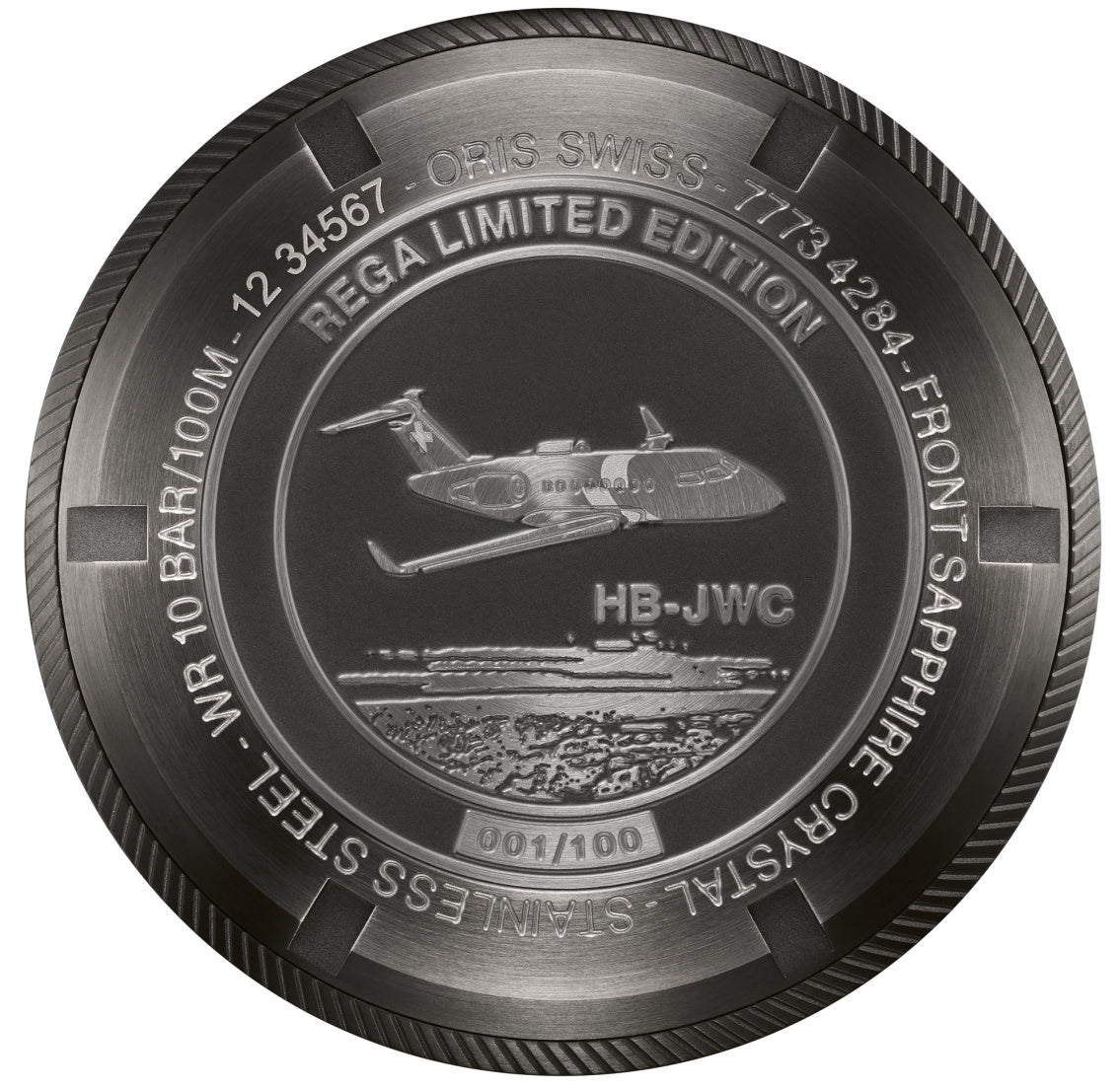 Oris Watch Big Crown ProPilot Rega Fleet Bombardier Challenger 650 HB-JWC Limited Edition 01 798 7773 4284 HB-JWC-Set. The Bombardier Challenger 650 BH JWC aircraft is part of Rega’s fleet of 21 lifesaving air rescue aircraft. The non profit organisation operates across the Swiss Alps and relies solely on donations from Swiss patrons to complete its vital work, saving lives and administering emergency medical treatment to critical patients. Oris has partnered up with the air rescue team to create a series of limited edition pilot’s watches that promise all the key characteristics of the popular Big Crown ProPilot watch first developed back in 1938. The watch is limited to 100 pieces worldwide and crafted from stainless steel with a gunmetal PVD coated finish. The back of the 41mm case is engraved with an image of the HB JWC aircraft, along with its unique tail number and a limited edition number for the series. The watch is also topped with a double domed sapphire crystal glass front and is fitted with an easy grip crown.