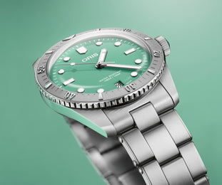 Oris Watch Divers Sixty Five Cotton Candy 01 733 7771 4057-07 3 19 03S. Following on from the hugely popular Divers Sixty-Five Cotton Candy in bronze, Oris is delighted to return to the playful design with a trio of pieces in steel. The new references carry on the story of the watch with the colourful dial palette in blue, green and pink, bringing a fun, poppy dynamic to the Divers Sixty-Five’s retro design profile. Each of the new watches has a stainless steel case and bezel and comes on either a three-link stainless steel metal bracelet or one of three recycled perlon straps in blue, green or pink to match the dials. The base watch remains Oris’s sporty, versatile Divers Sixty-Five, which is named after the year of Oris’s first diver's watch. This brings a sapphire crystal, a screw-down crown, 10 bar (100 metres) of water resistance and a Swiss Made automatic mechanical movement with a date indication. The watches are detailed with SuperLumiNova®, including in the lollipop central seconds hand.