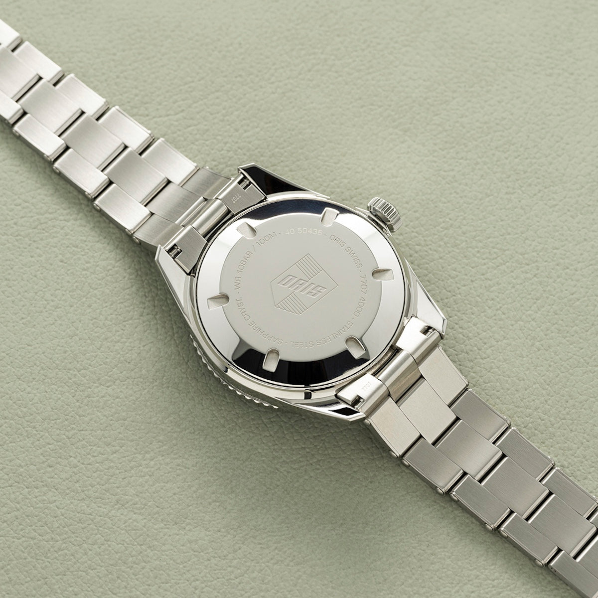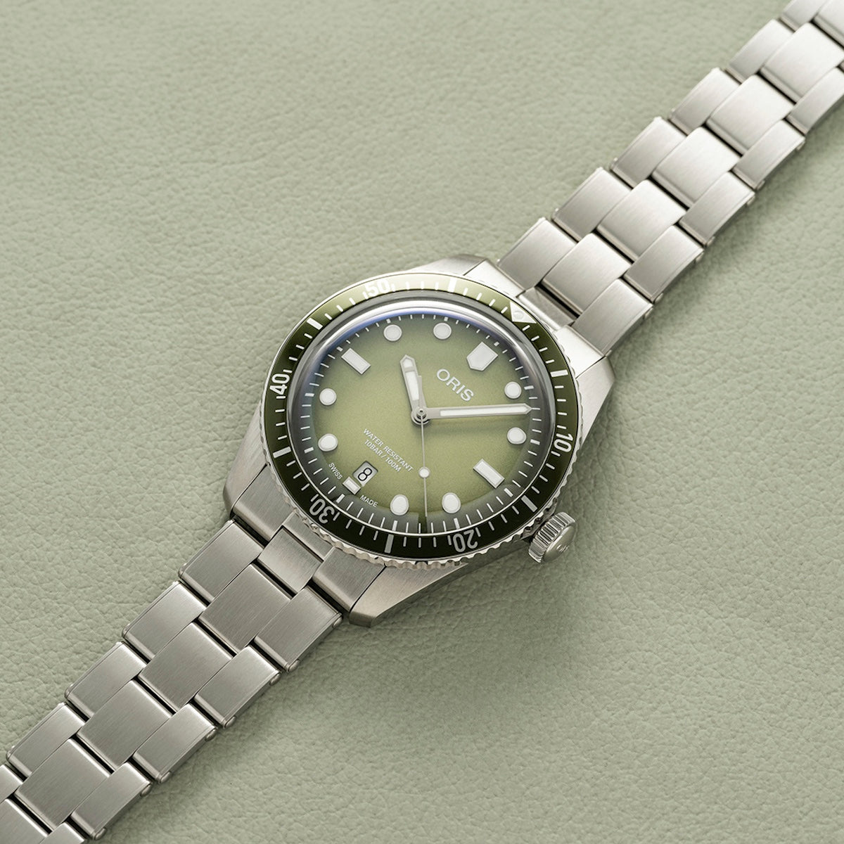 Oris Watch Divers Sixty Five Date 01 733 7707 4057-07 8 20 18. This summer, Oris are inviting you to indulge in nature, with the calming forest green hues of the new Divers Sixty-Five 40.00 mm. The original, gently graduated colourway of the watch’s dial and bezel was inspired by the dense forests that surround our historic factory in the Swiss village of Holstein, deep in the Waldenburg Valley, our home for 120 years. As eternal is the joyful, playful spirit of our retro Divers Sixty-Five, a contemporary revival of our first out-and-out sports watch of 1965. It features a 40.00 mm stainless steel case and a matching three-link bracelet with a folding clasp, while inside it is Calibre 733, our high-quality Swiss Made automatic that powers time and date functions. Further quality signifiers include a screw-down crown, a domed sapphire crystal, lumed hands and indices, and water resistance to 10 bars.