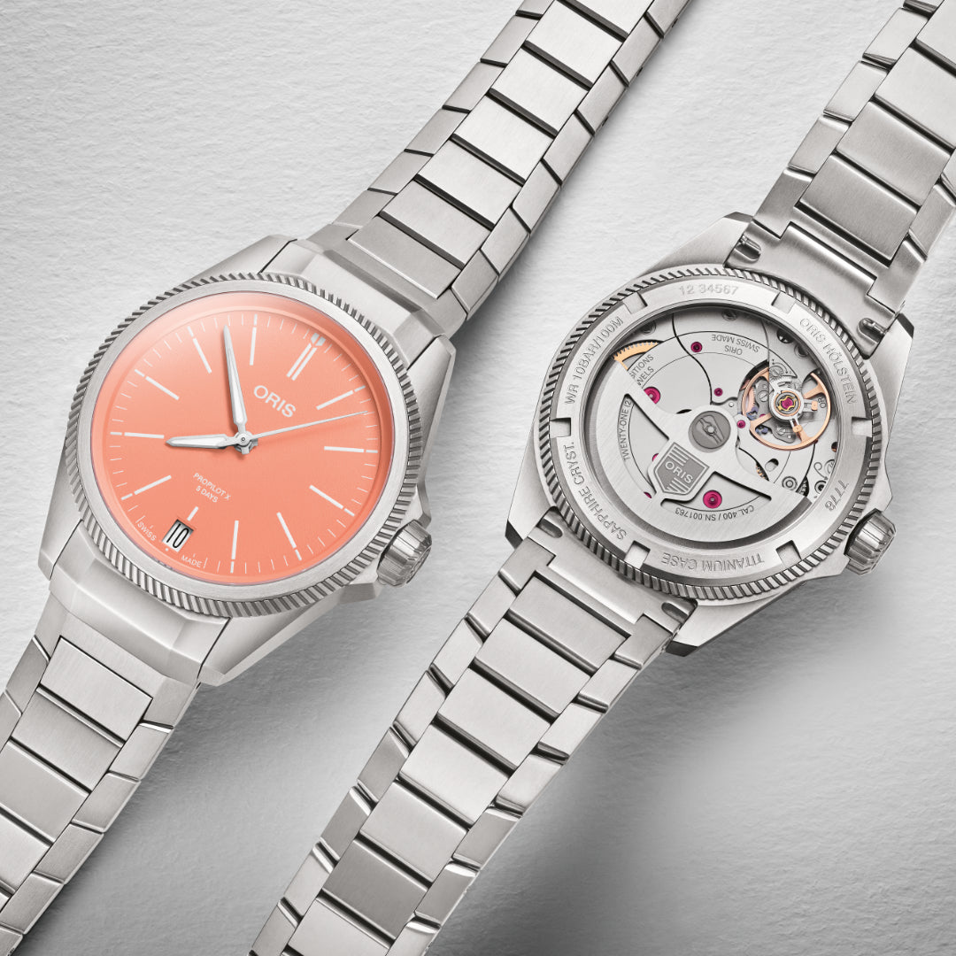 Oris Watch ProPilot X Calibre 400 Salmon 01 400 7778 7158-07 7 20 01 TLC. The joy of mechanics comes to the fore in the new ProPilot X Calibre 400, a titanium cased watch inspired by more than a century of aviation heritage and powered by our five day automatic.