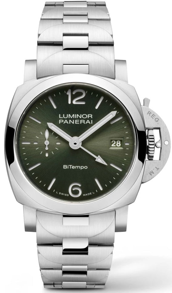 Panerai Watch Luminor Quaranta BiTempo 40mm Green PAM01640. Luminor, the essence of Panerai, is a symbol of Italian design and Swiss Watch-Making. Recognizable, solid and iconic, Luminor features the patented crown-protecting device.
